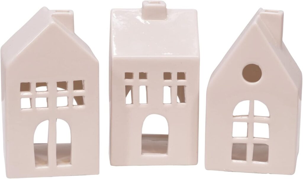This look is the perfect mix of cozy farmhouse and clean minimal. The natural wood floating shelves add warmth, while the little details—like framed prints, amber jars, and those adorable house figurines—make it feel personal and lived-in.